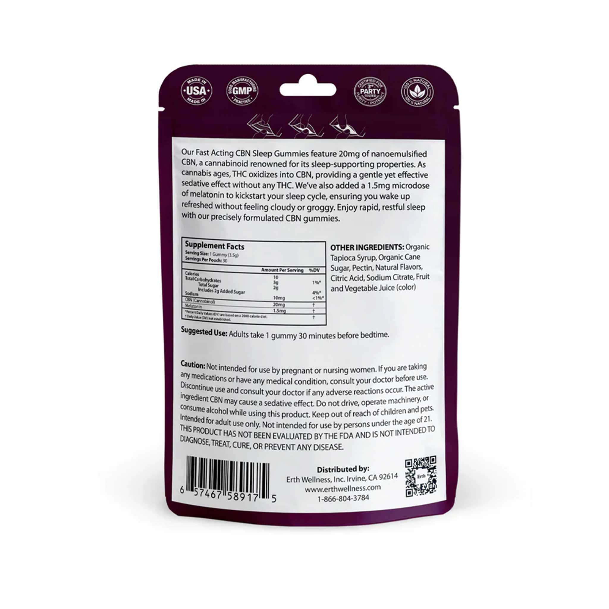 Erth Wellness SLEEP Gummies are your new nighttime ritual. Each vegan gummy delivers a powerful 20mg of CBN, a hemp-derived cannabinoid known to promote deep, restful sleep without the need for THC. Flavored with juicy Sleepy Blackberry, these gummies help ease your mind and relax your body—without any intoxicating effects.